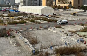 築地市場駅を出てまず驚くのが「巨大な更地と掘り起こされた地面」。大きなトラックが何台も出入りしていて、囲われた塀越しでもその規模の広大さがわかります。